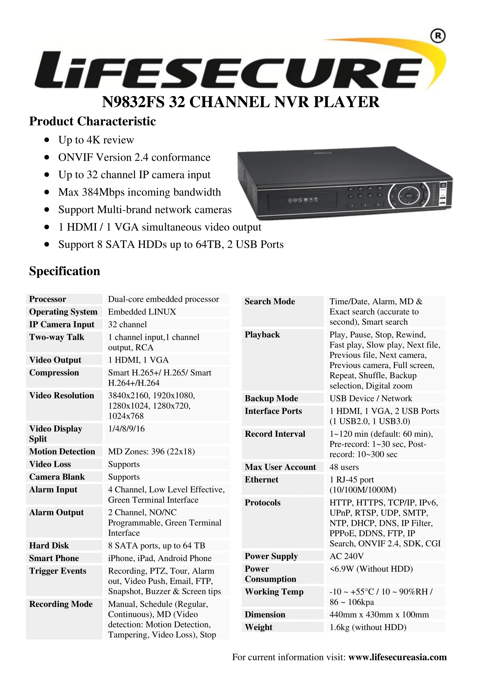 LIFESECURE N9832FS 32 CHANNEL NVR Player